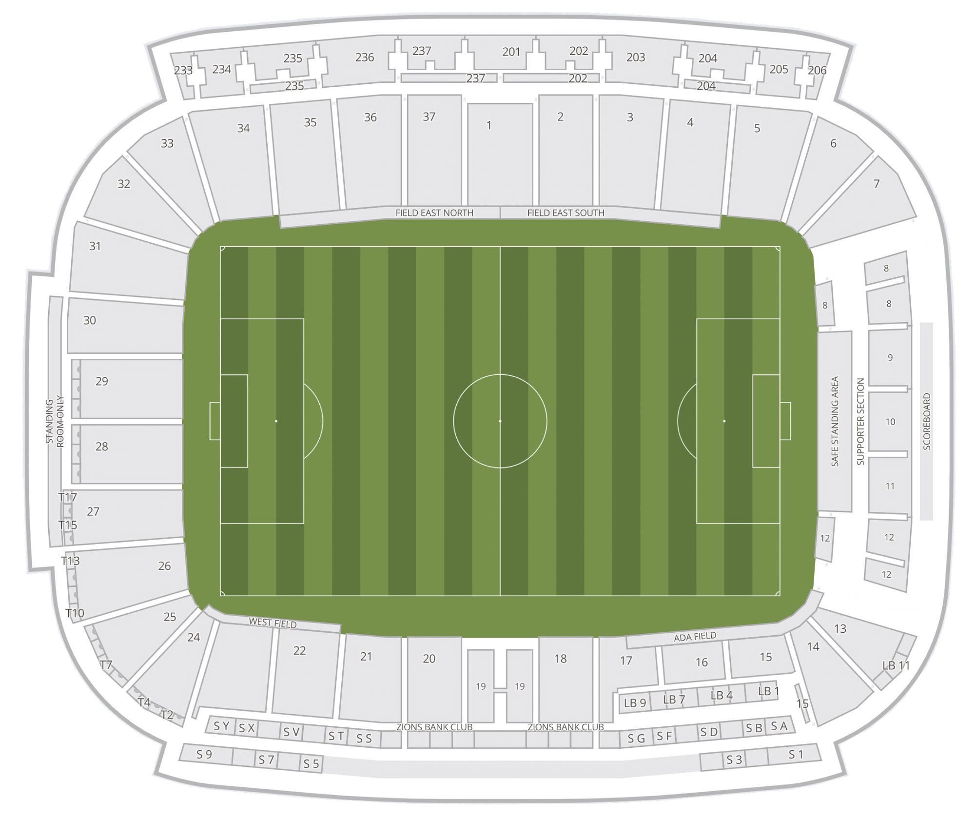 For NWSL matches in Utah, tickets aren’t sold for the southern side behind the goal, as seen on the diagram above, or for the uppermost decks. Total capacity in this configuration is closer to 16,000 to 18,000.