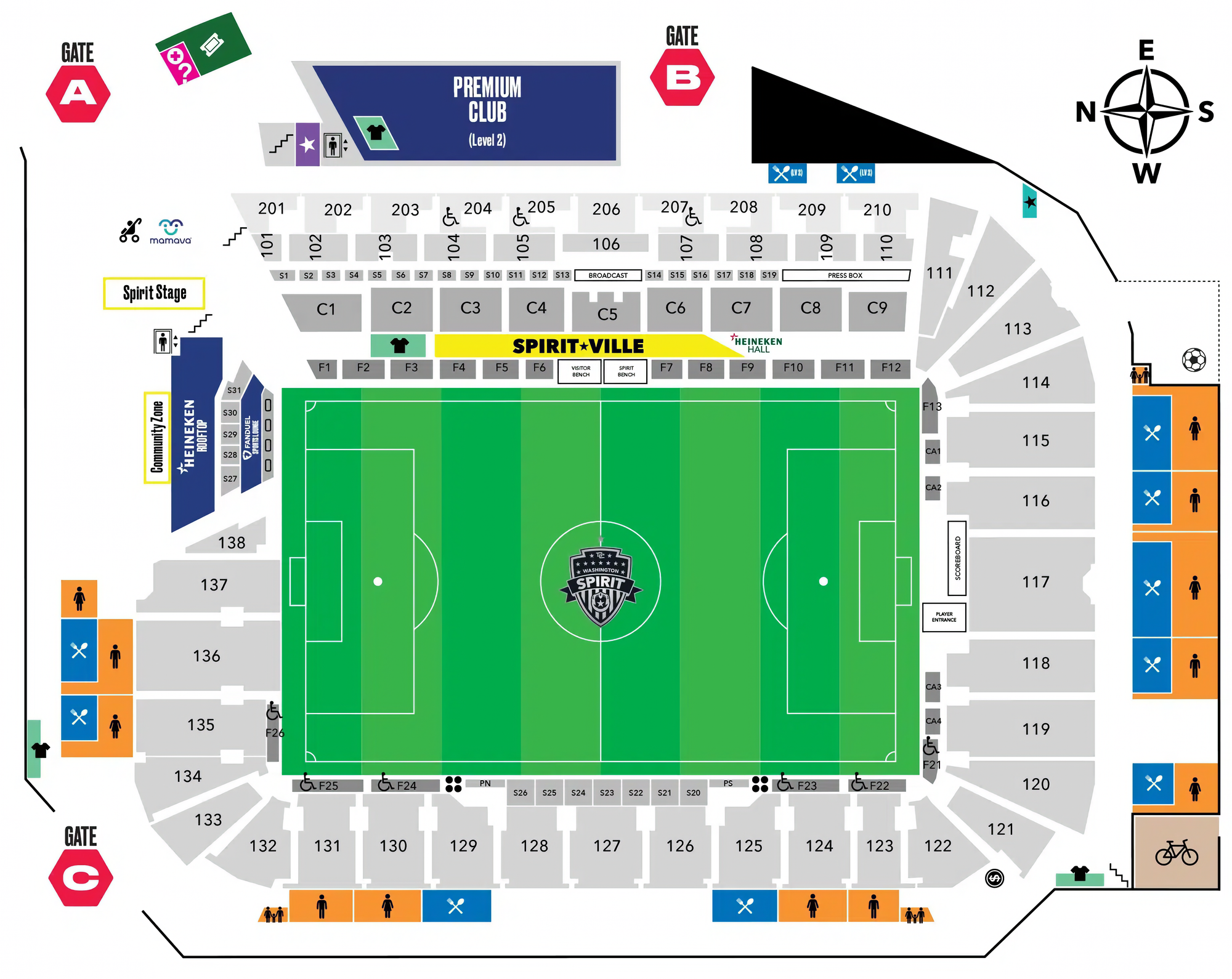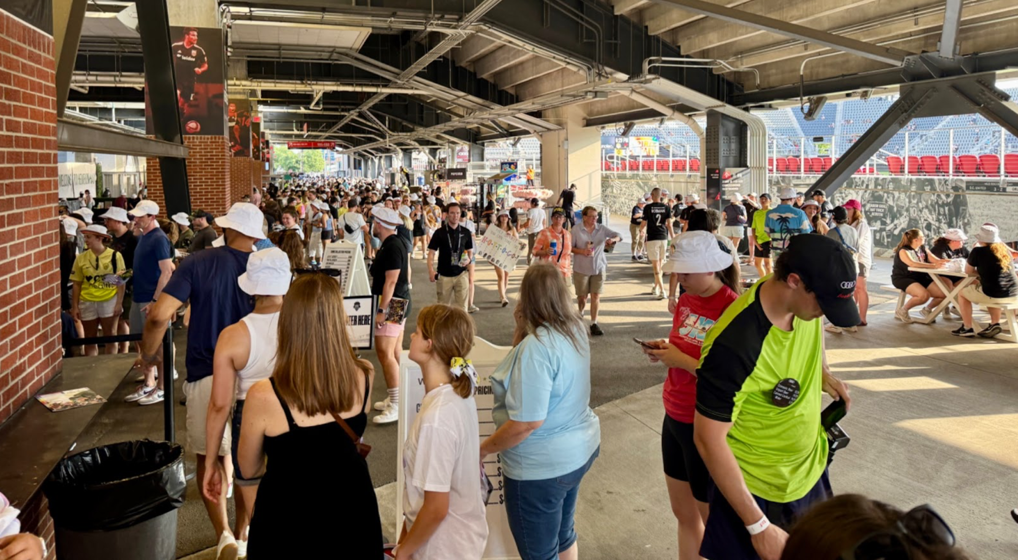 Audi Field is a European-style, steep-sided pitch with a generous concourse area below with lots of room for concessions surrounding the park. Spectator capacity maxes out around 20,000, and for the 2025 season, most Spirit home games attracted over 15,000 fans to each match.