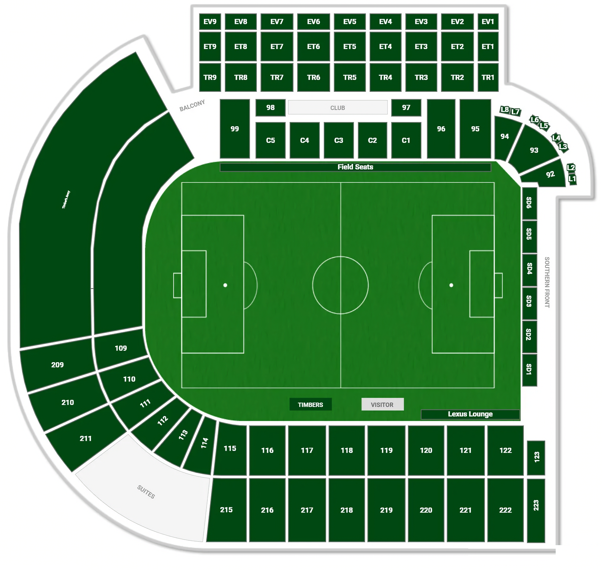First up: The “old” part of the stadium are the numbered areas in the lower part of the seating chart above. The sections in the 100s are more exposed to sun and rain and have plastic seats. The upper 200 levels are mostly wooden benches but are under an overhanging roof providing shade and rain coverage. The newer side of the stadium is at the top of this figure where you find the sections labeled EV, ET, TR, 92-99, and C1-C5.