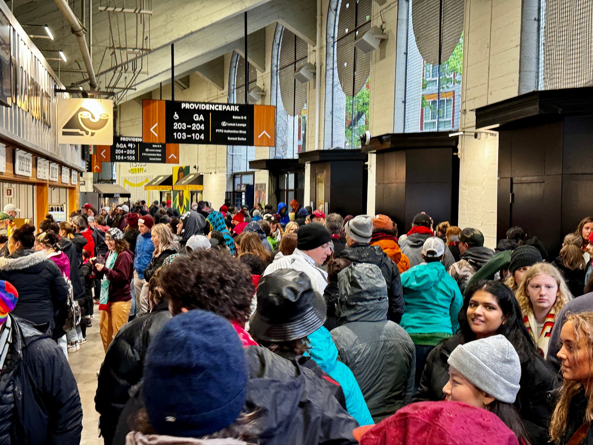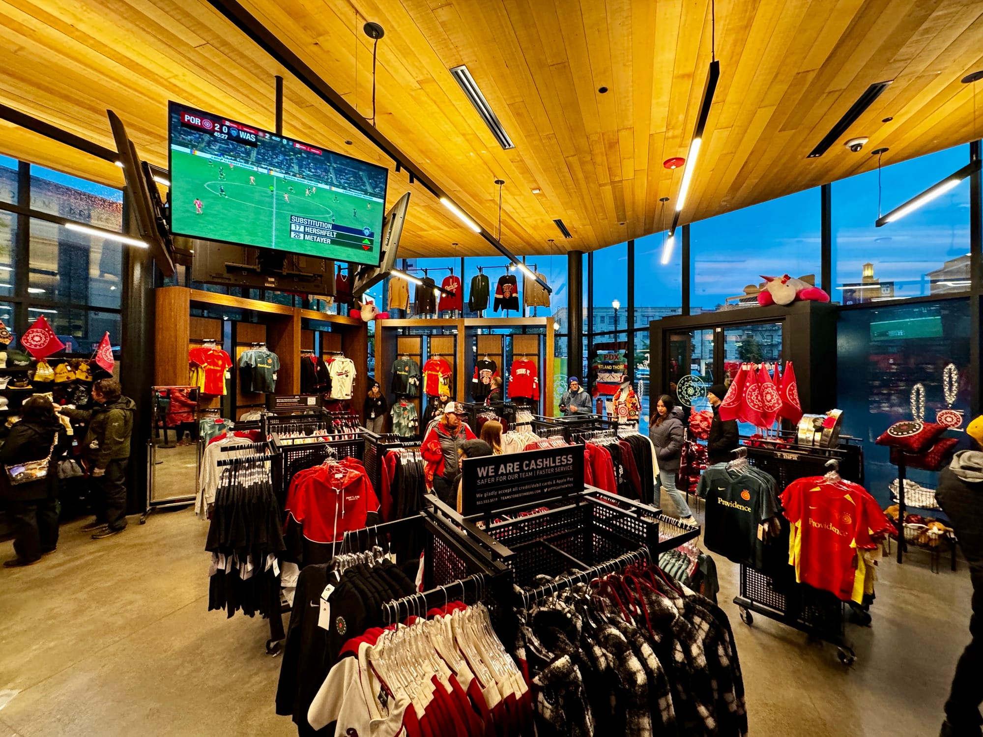 Portland’s stadium has a large brick-and-mortar store you can enter from the stadium side during games, and it’s open during normal business hours seven days a week outside of games. There’s also another permanent store on the newer side of the stadium where you can shop inside during games. Additionally, there are two pop-up places around the concourse area with Thorns gear for sale at every match. In some fancy parts of the stadium (like TR, the Toyota Ridge level), you can even order things off the Thorns website and have them delivered to your section for pickup during a game.