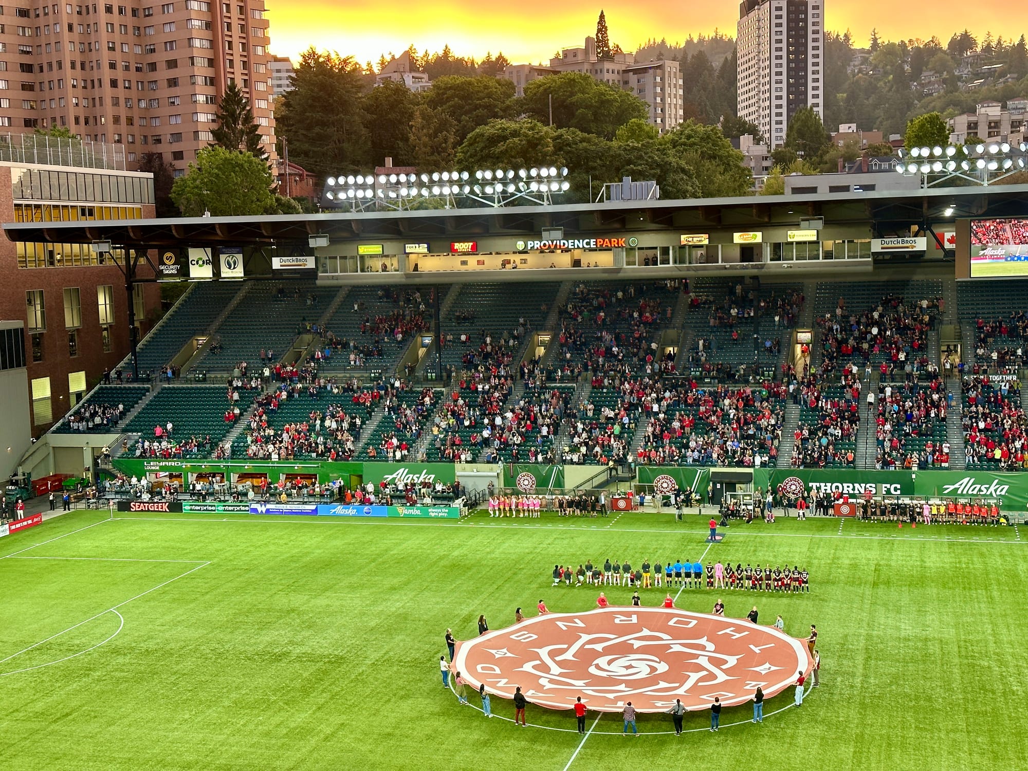 Post-game, crowds disperse fairly quickly as people head to the exits. The Portland Thorns typically walk a slow lap together around the stadium for fans to cheer and wave, and when the Thorns win, they have a rose ceremony at the northern goal, with each goal scorer getting a rose and the goalie getting one too if they got a clean sheet that day.