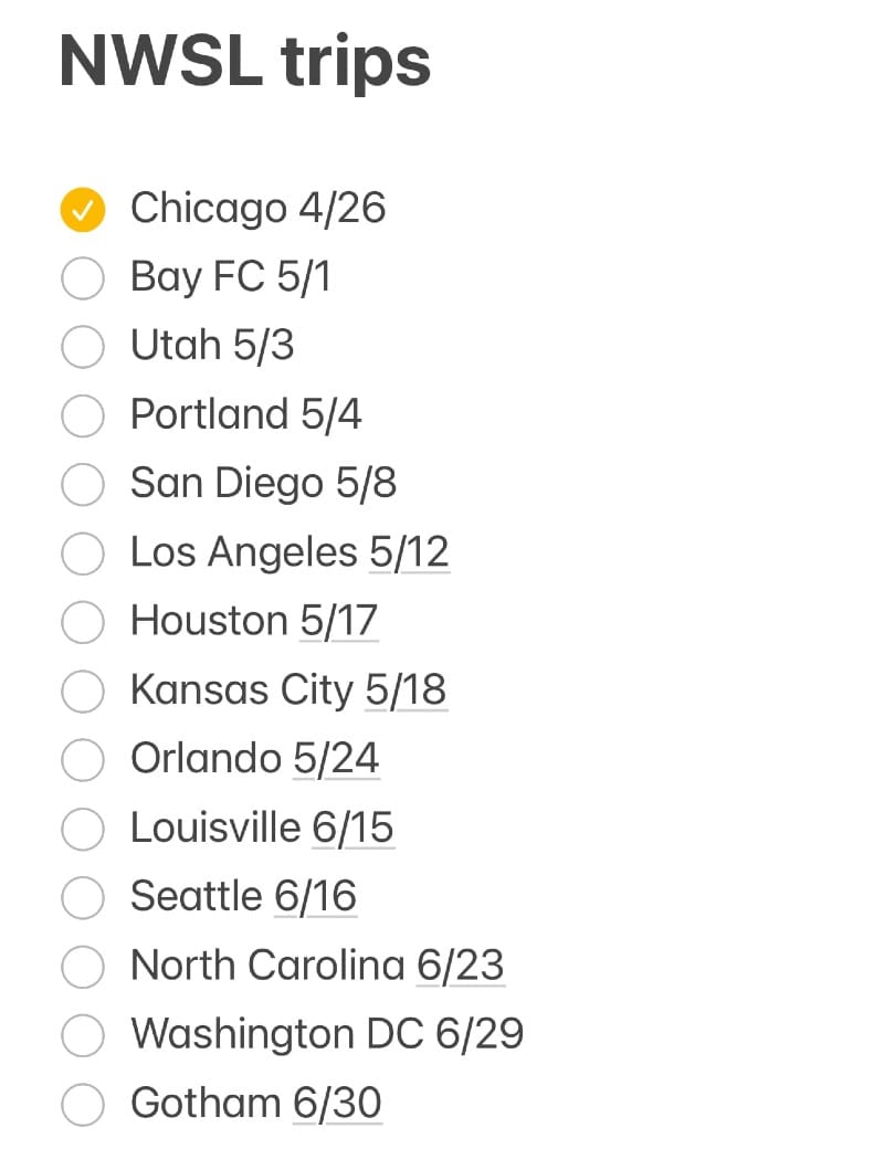After days of calendar juggling, knowing I had a couple weekends of previous plans while also trying to stack up nearby stadiums into single weekends, I can get all the stadium visits completed before the NWSL takes their long break for the Olympics in July.